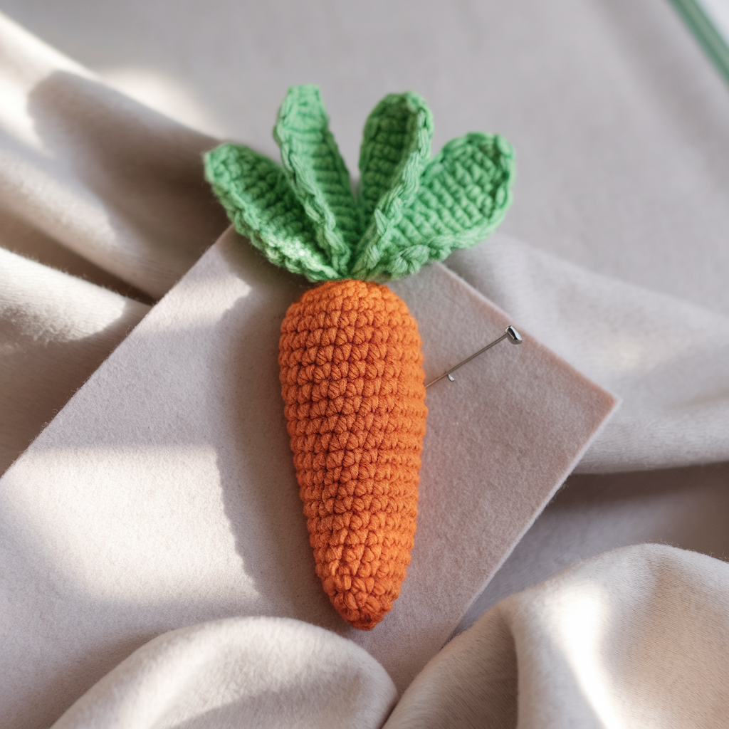 - Yarn: cotton or cotton-blend fingering/DK for crisp shapes; sport/DK or light worsted for chunkier brooches. Avoid super-fuzzy yarns unless you want a shaggy carrot.