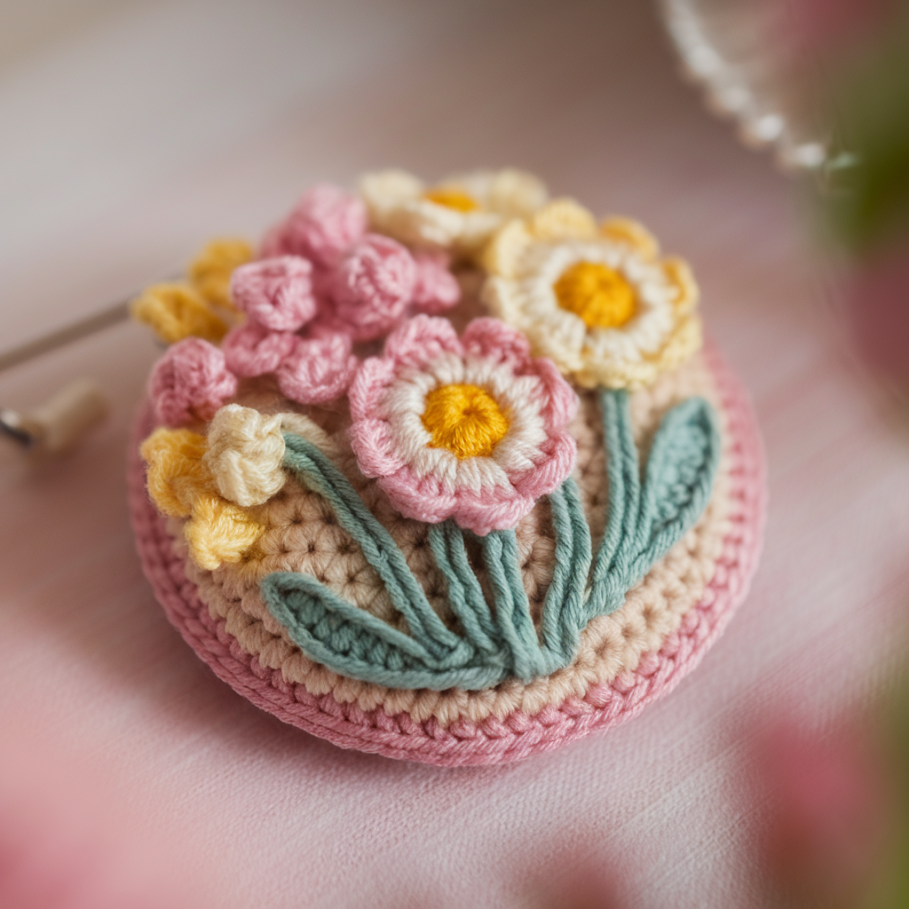 Materials: DK cotton or cotton-thread, 3.5 mm hook, tapestry needle for embroidery, embroidery floss or contrasting yarn (2–3 colors), felt backing, brooch pin. Yarn ~15–25 yds for base + embroidery threads.