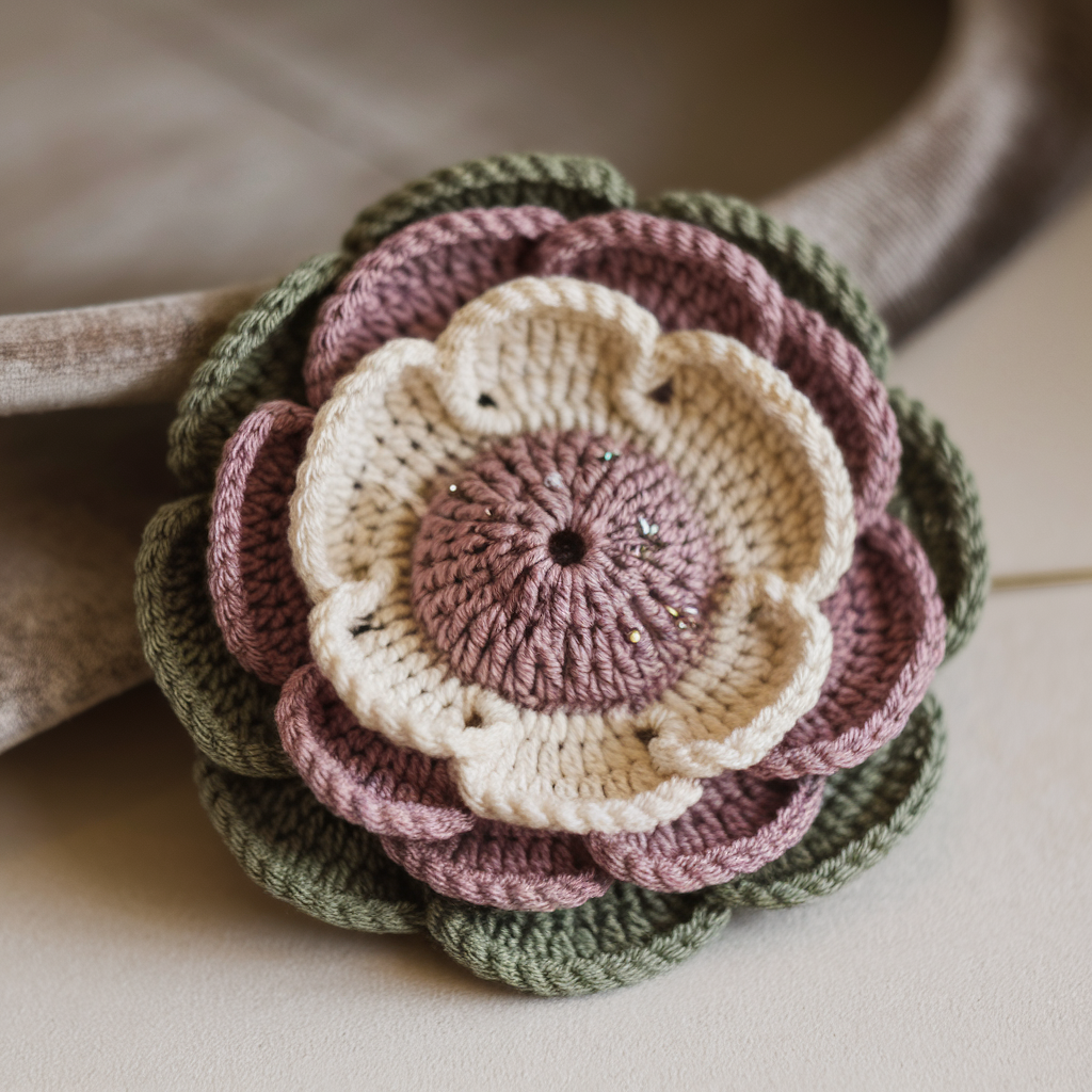 Materials: Mercerized cotton size 5 or DK, 3.5 mm hook for crisp petals, small 1/2″ bead or embroidered center (optional), felt backing, brooch pin. Yarn ~15–30 yds depending on layers.