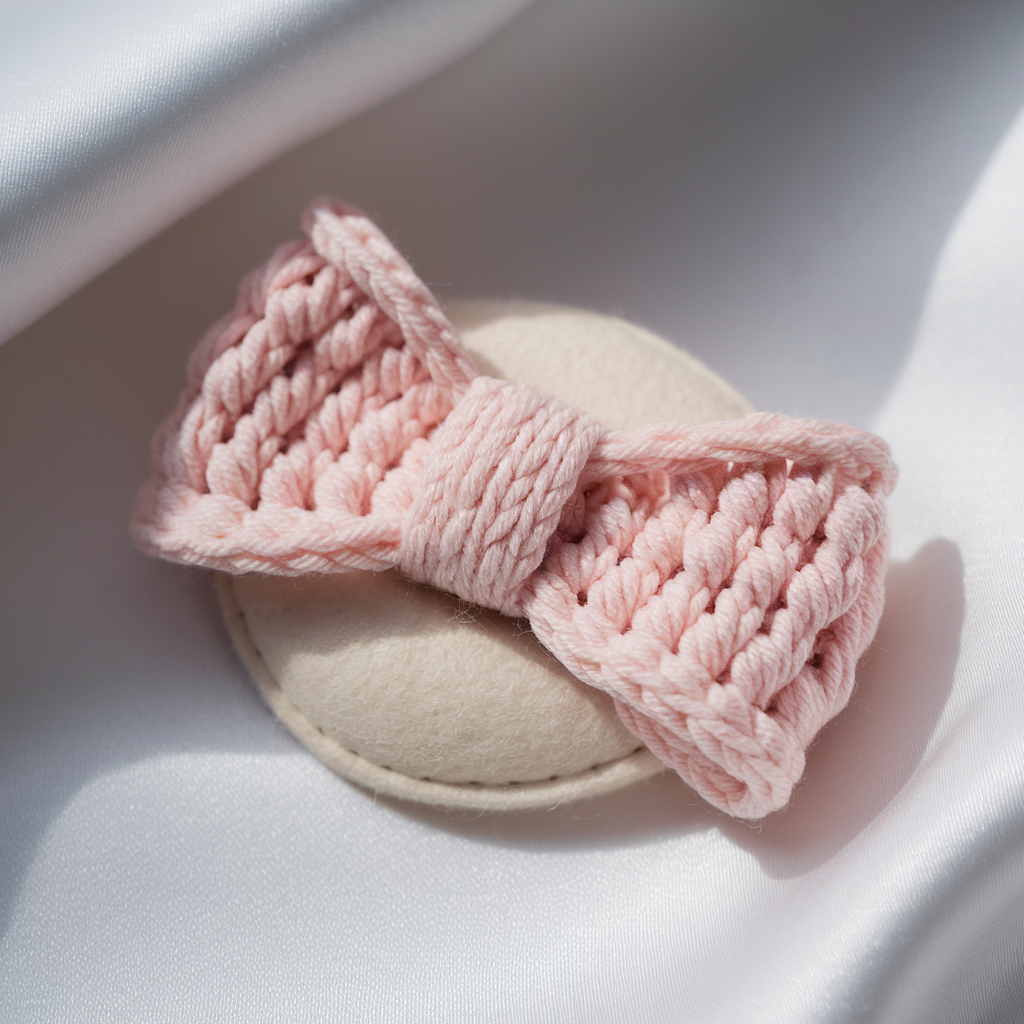- Sew the felt + pin to the back of the bow with small stitches, catching both yarn and felt to distribute strain.