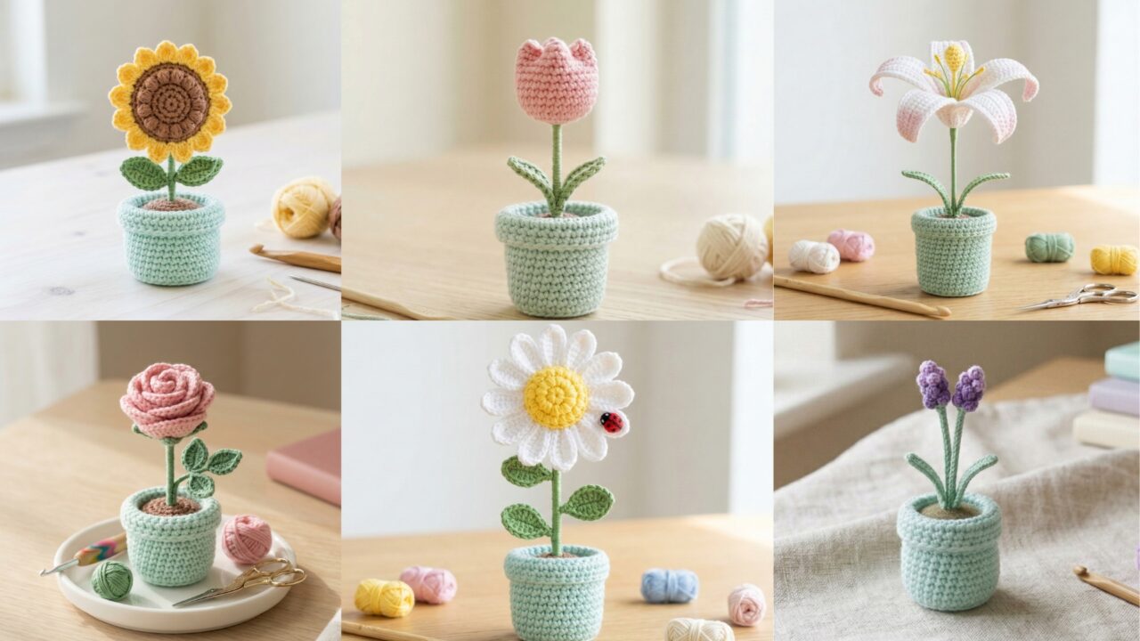In this guide, you’ll discover six adorable crochet flower pot patterns that are perfect for decorating shelves, desks, or gifting to friends and family. Each design includes step-by-step instructions to help you crochet beautiful flowers growing from their own little pots. You’ll learn how to create a cheerful sunflower, a graceful tulip, a classic daisy, an elegant lily, a romantic rose, and a calming lavender arrangement.