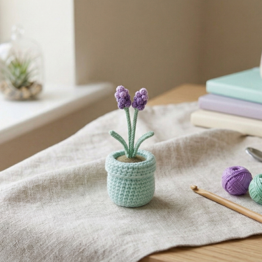 - Pot yarn, lavender or purple yarn, green yarn (for stems), stuffing, 3.5–4.0 mm hook