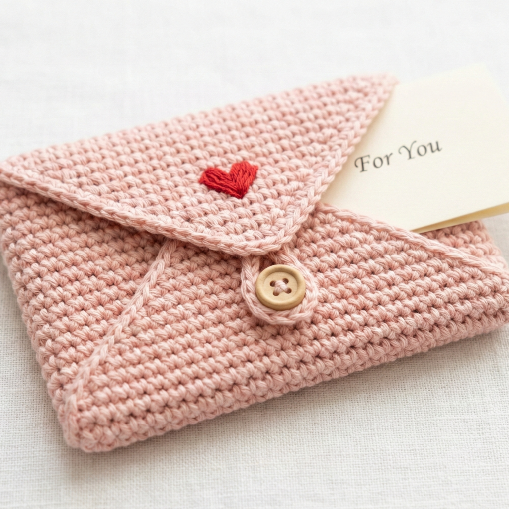 This tiny crochet envelope is ideal for love notes, gift cards, or small chocolates.
