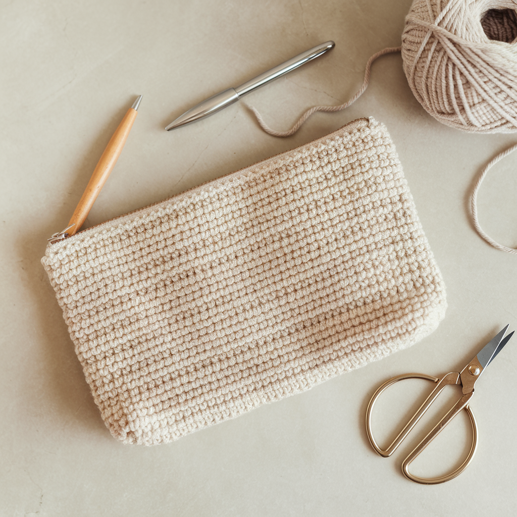 Style: Sleek, modern pouch with knitted-look ribbing using back loop-only stitches. Minimalist and elegant.