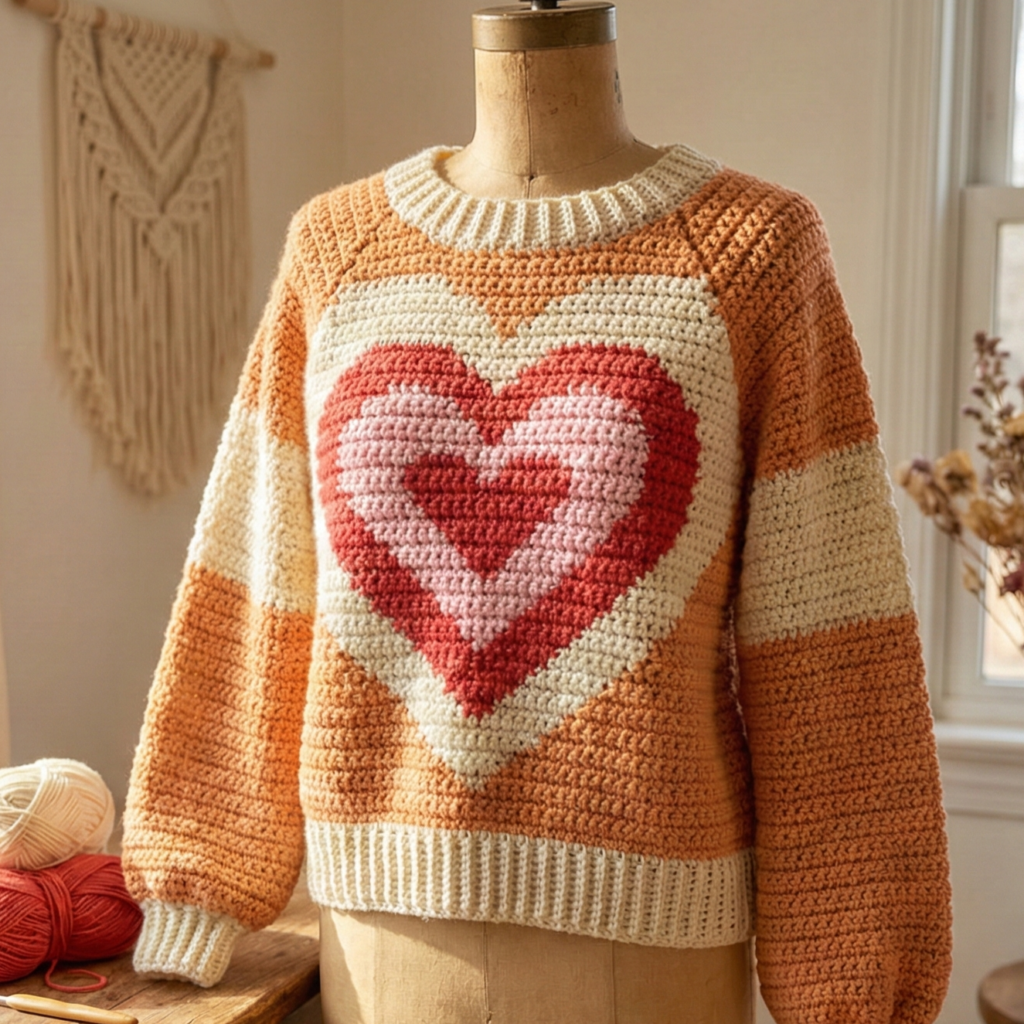 - Structure: Top-down raglan yoke with a centered heart motif across the chest (charted colorwork). Body worked in half double crochet (HDC) for a soft drape. Ribbing worked in back loop only single crochet (BLO SC) for stability.