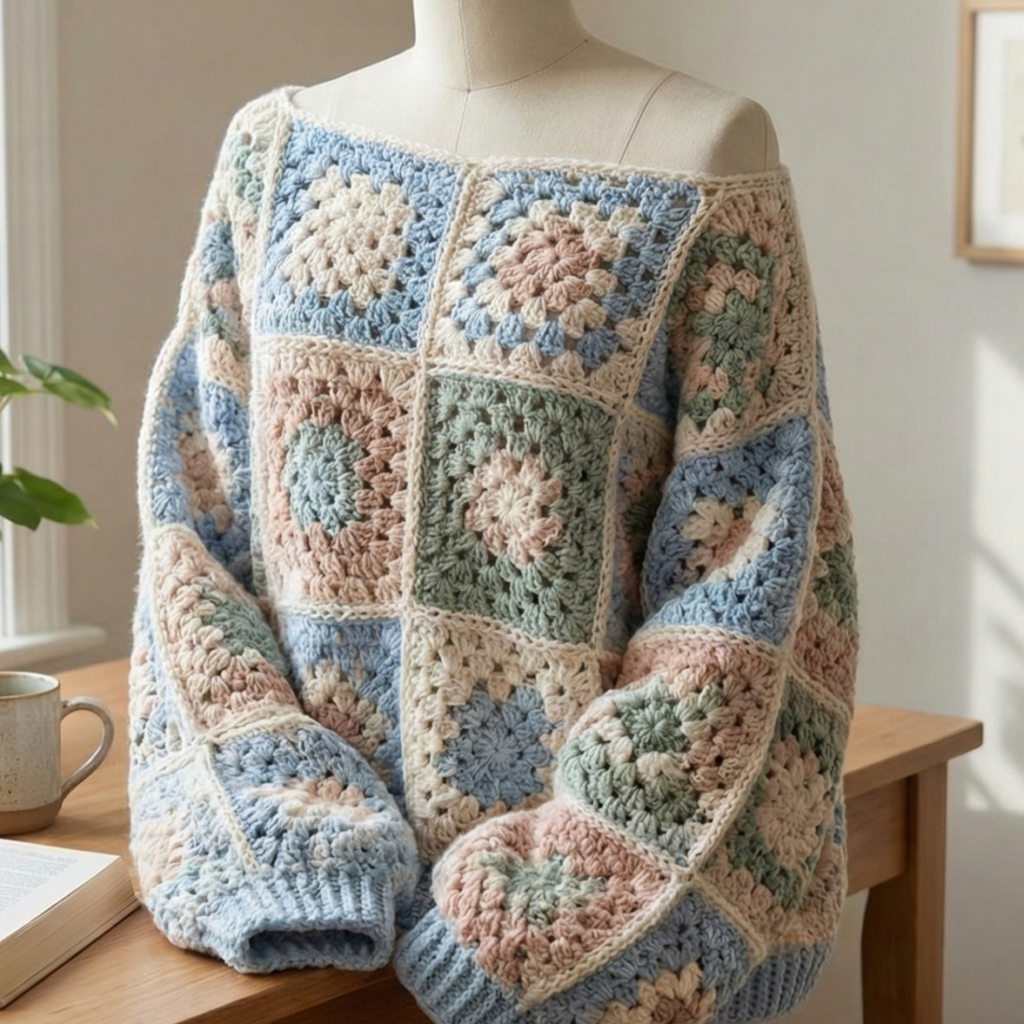 - Construction: Make a grid of granny squares (classic 4-round granny or layered square), join together in a tube for torso and make sleeve strips or attach full square sleeves.