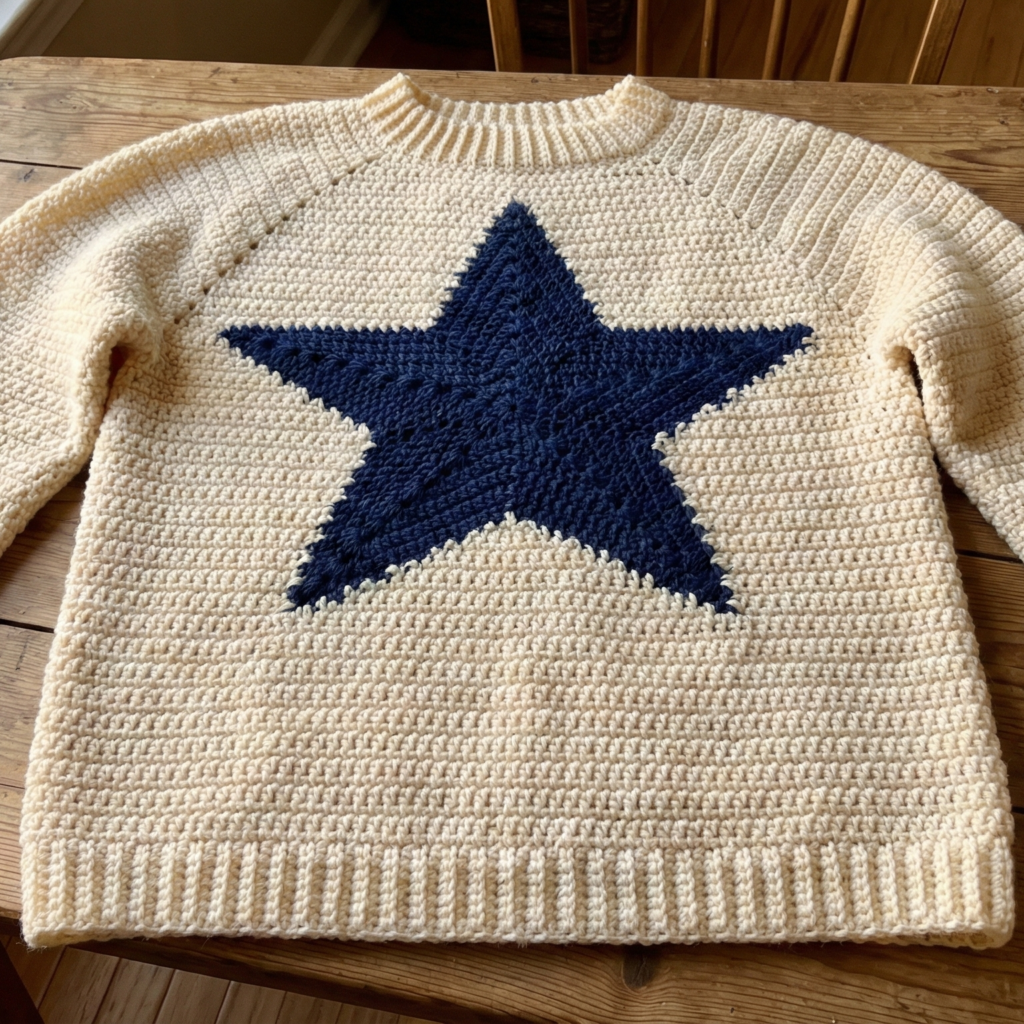 - Circular stranded colorwork yoke (star motifs) worked top-down; body in double crochet (DC) or half-double for warmth. Sleeves set-in or raglan depending on yoke construction (we’ll use circular yoke with minimal seaming).
