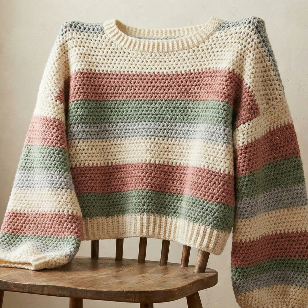 Advanced Beginner — minimal shaping, easy stripes, boxy fit.