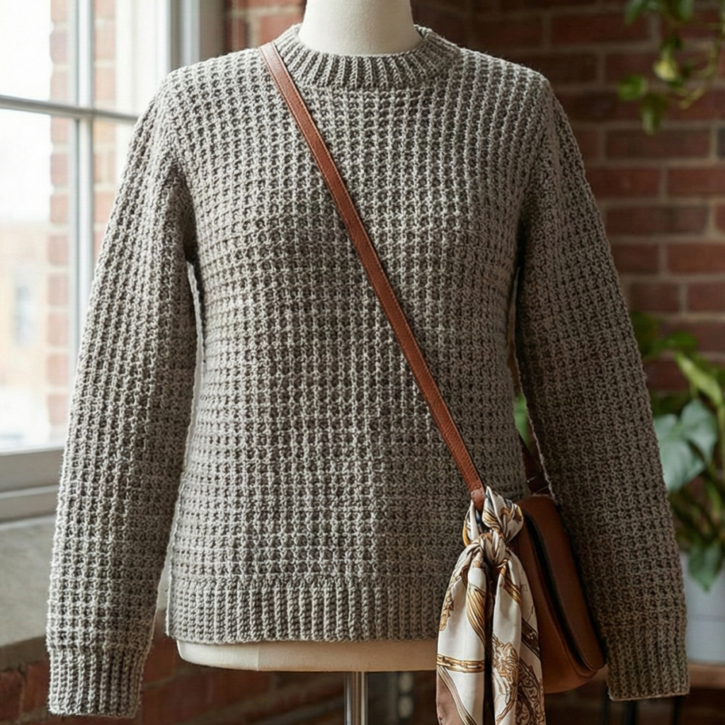 - Pullover with textured body (e.g., broken waffle or basketweave stitch) and set-in sleeves for a polished silhouette. Worked bottom-up in pieces, seamed at shoulders and sides.