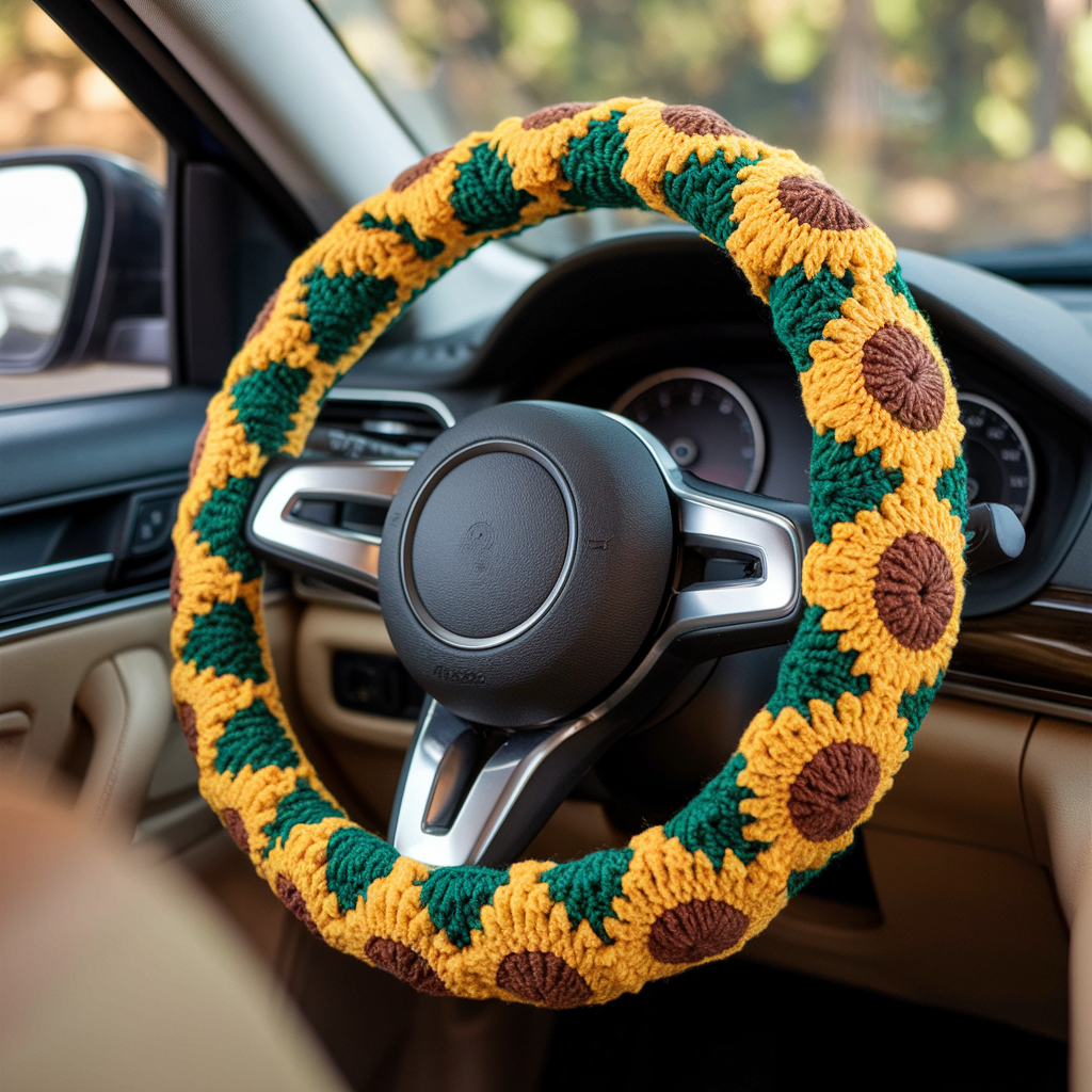 3. Crochet Sunflower Granny Square Car Steering Wheel Cover Pattern