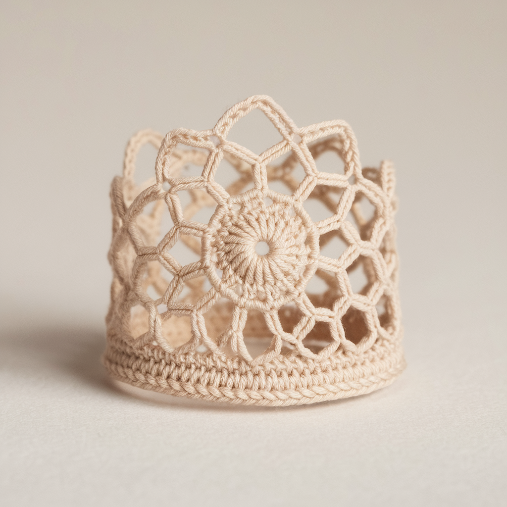 Delicate filigree ring made of mesh rounds that read like metal lace. Works best with crochet thread size 8–10 and a tight hook.