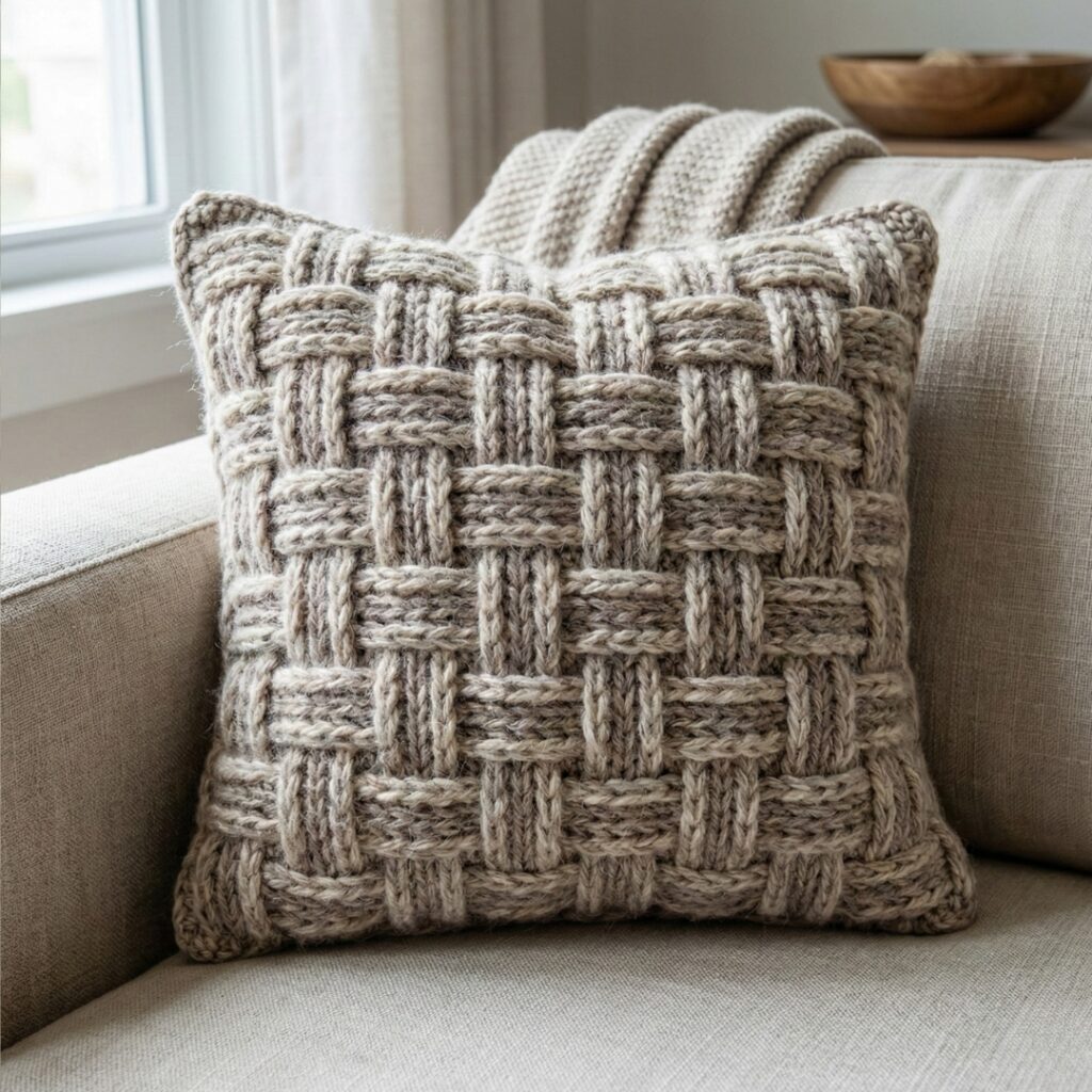 Basketweave uses alternating front-post and back-post stitches to create a reversible woven texture that reads like a woven basket — excellent for cozy, tactile pillows.