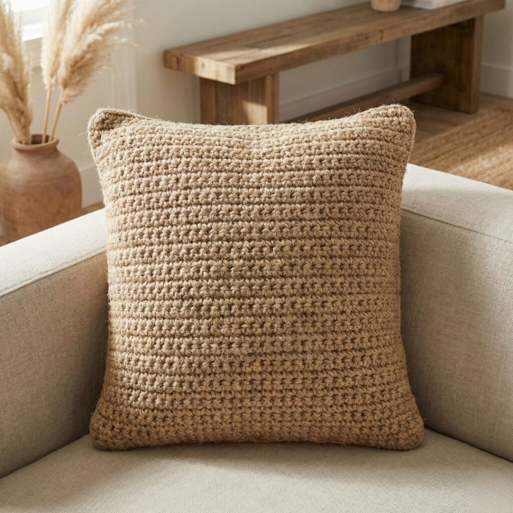 - MR, work 6 sc. Increase in rounds until a base diameter approximates pillow width when folded (usually slightly smaller because jute is thick). For a 16″ pillow and bulky rope with ~2 sts/in, chain math would differ — better to measure as you go until the flat circle is a few inches less than pillow width, typically 8–10″ to be joined with sides to reach final dimension.