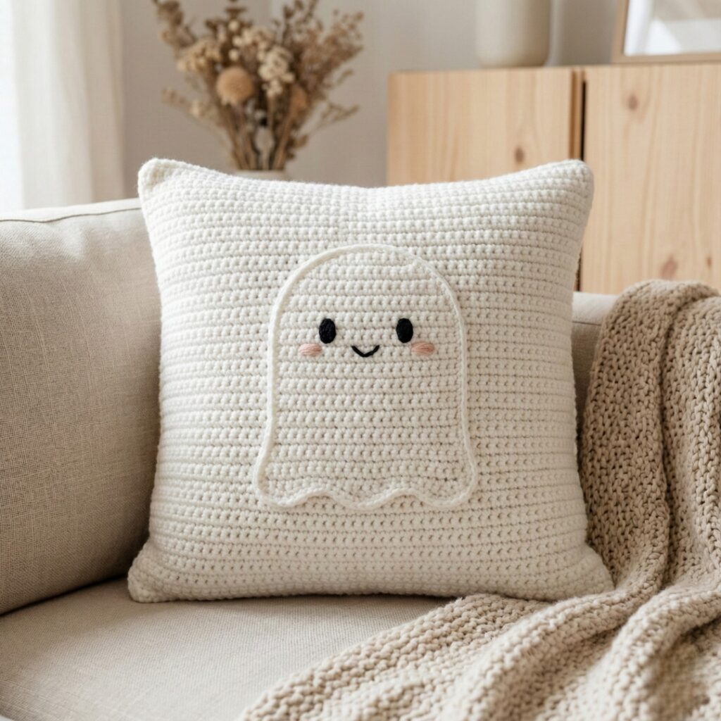A playful ghost motif as a square or circular pillow — great for seasonal decor or a kid’s room.