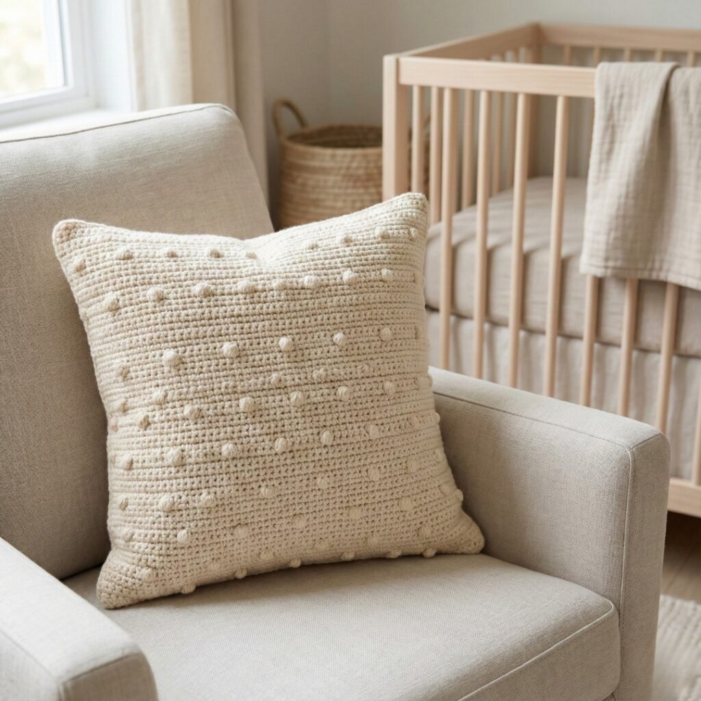 A soft, neutral pillow in buttery pastels or warm grays using plush textures (waffle stitch, shell stitch, or bobble clusters) that are soothing and baby-safe.