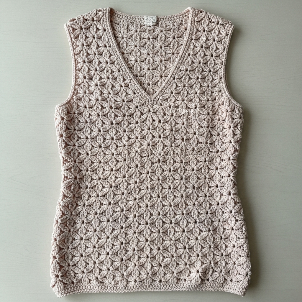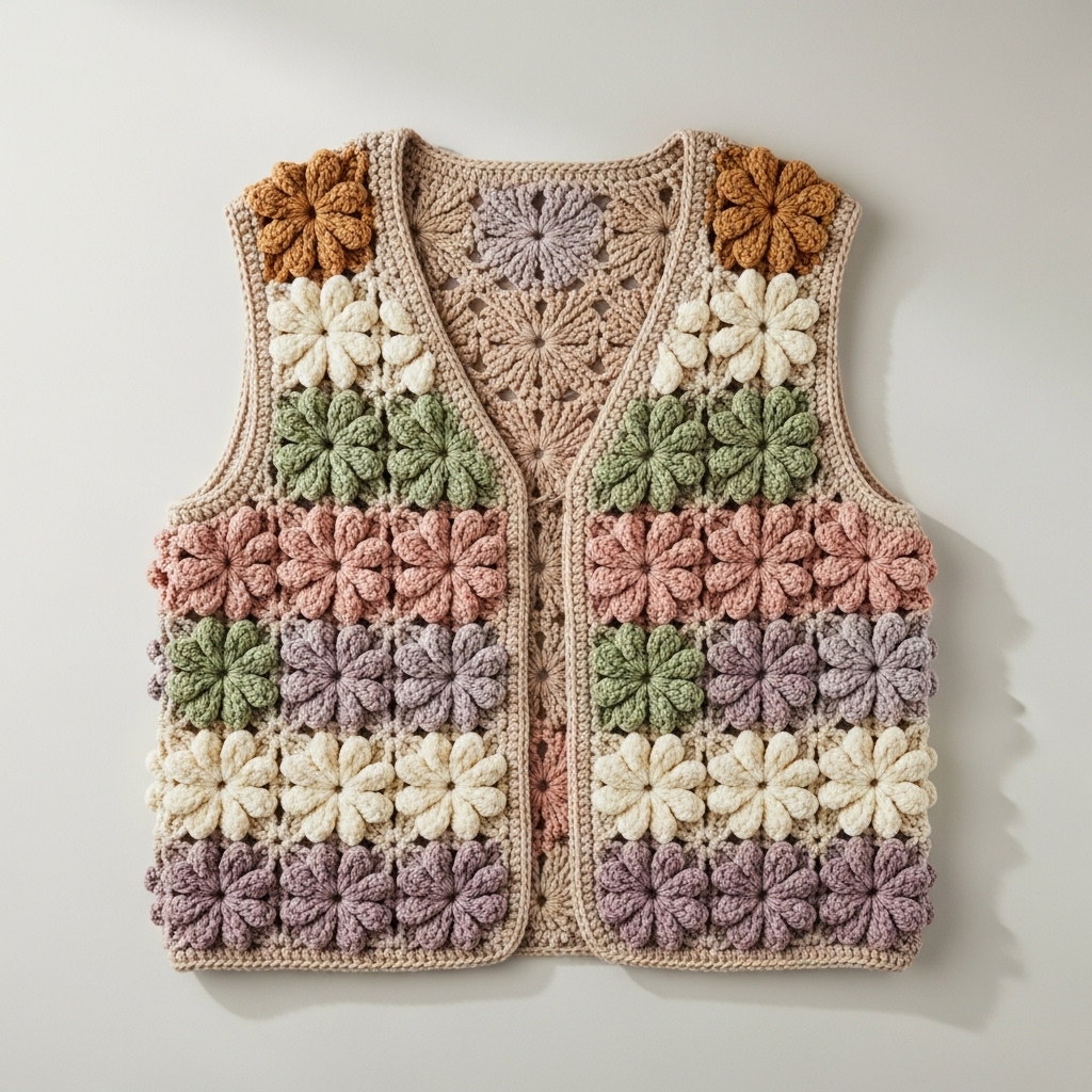 - Small 5-petal flower (approx 2–3 in): MR; ch1; 10 sc in MR; sl st. Round 2: ch4, sl st into next sc × 5 to form 5 loops. In each loop work (sc, hdc, dc, hdc, sc) to shape petal. Make 8–12 flowers for a cropped vest, more for full coverage. Make 2–3 tiny blossom centers (puffs or beads optional). Block flowers with a little steam to open petals.