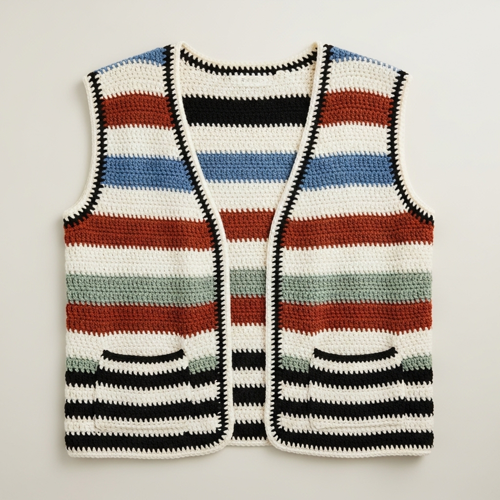 - Work 1–2 rounds of sc around armholes and front edges to stabilize. A reverse single crochet (crab stitch) on the external edge gives a tidy rope-like finish that complements geometric lines.