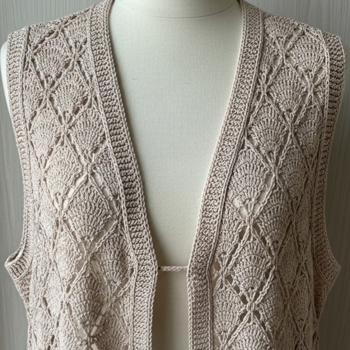 - Work 1–2 rounds of sc around armholes and front edges for a neat finish. For a decorative look, add a shell round on the hem.