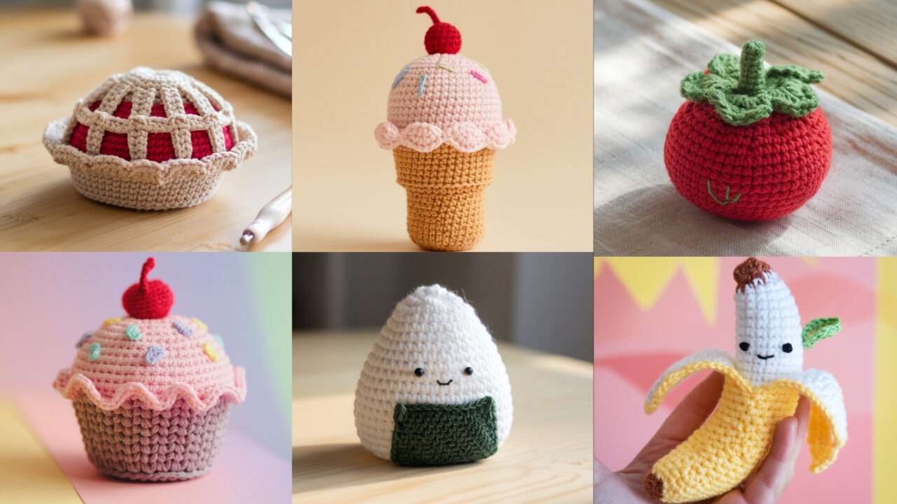 These six play-food amigurumi patterns — ice cream, banana, cupcake, rice ball (onigiri), mini pie, and tomato — are compact, fast-to-make, and great for building a child’s imaginary kitchen or a small market stall. Each project teaches slightly different shaping and finishing skills: spheres and domes, tapering cones, flat panels and seaming, surface embroidery, and small appliqués.