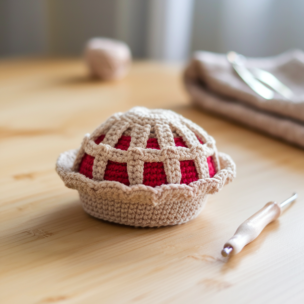 - Worsted yarn: crust color (beige/brown), filling color (apple = tan/amber, cherry = red), whipped topping color (cream)