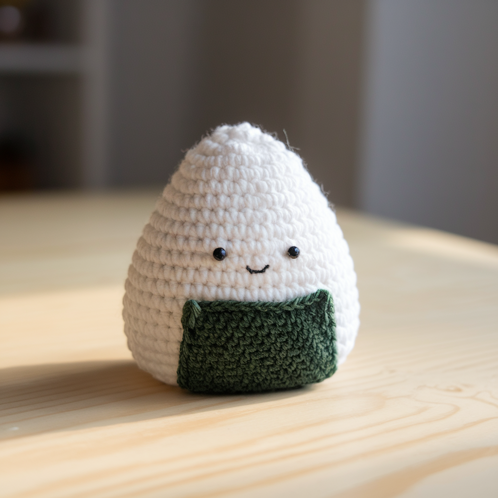 Triangle shaping: To make the rice ball triangular look, fold the finished sphere into a triangle and sew a few lines from top center to base edges to create the three sides (like a kite). Use yarn to stitch faint seam lines that shape it into a triangle when tightened. Alternatively, after step R6 you can lightly flatten one side to form the base and then whipstitch edges to form three flat faces.