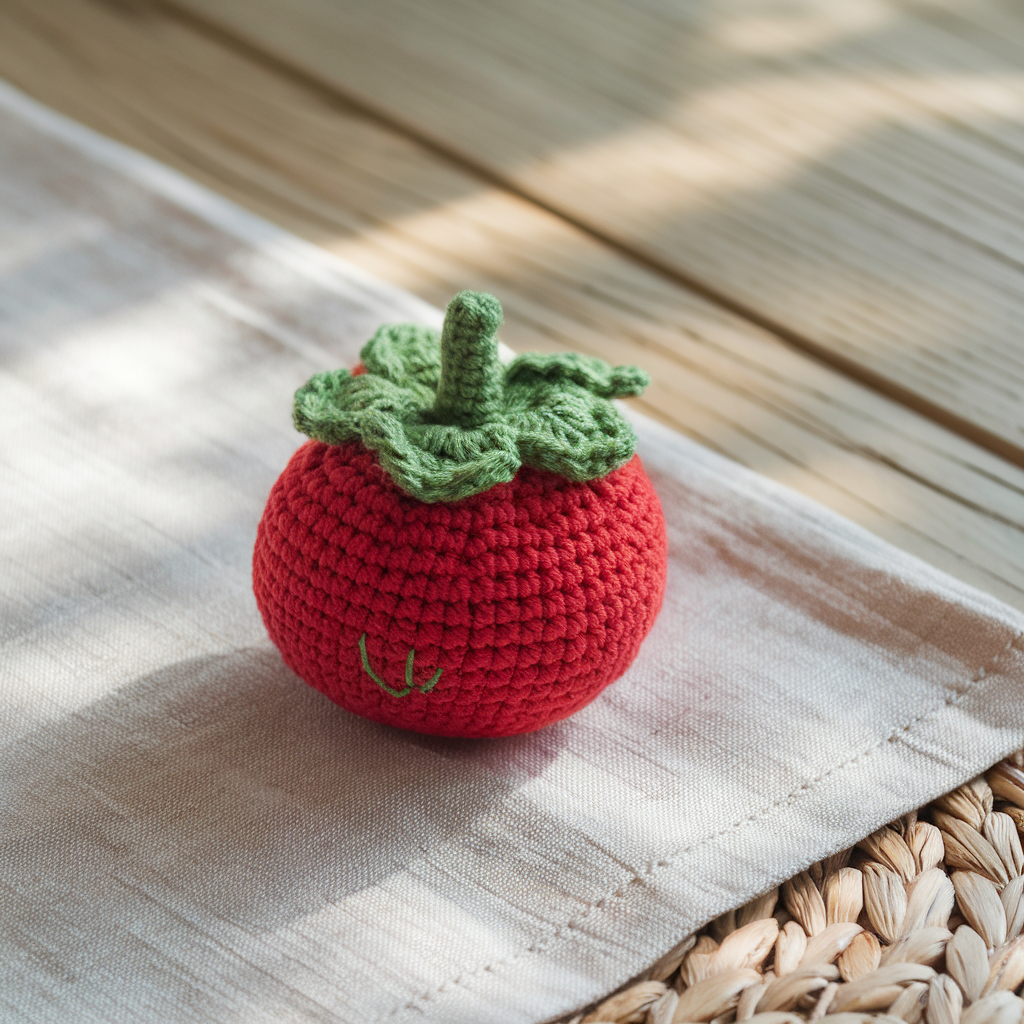- Worsted-weight yarn red (tomato), green for calyx & stem, brown for optional tiny seed embroidery