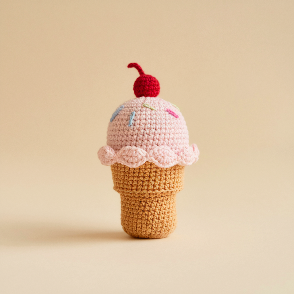 - Worsted-weight yarn (Category 4): cone color (tan), scoop color (pink / any), cherry color (red), small amount brown/black for sprinkles (optional)