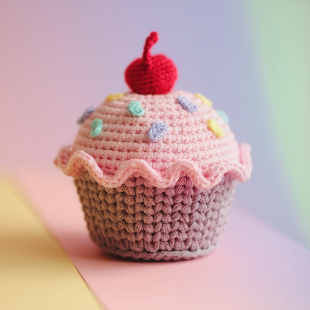 - Worsted yarn: cupcake liner color (brown/neutral), frosting color (pink/white), sprinkles color small bits, cherry red for top