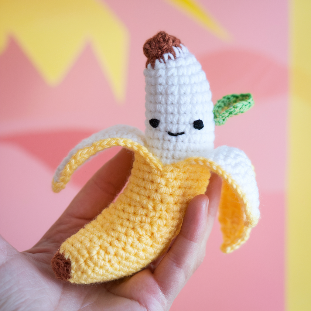 - Worsted-weight yarn: banana yellow, brown for tips, small bit of green for stem if desired