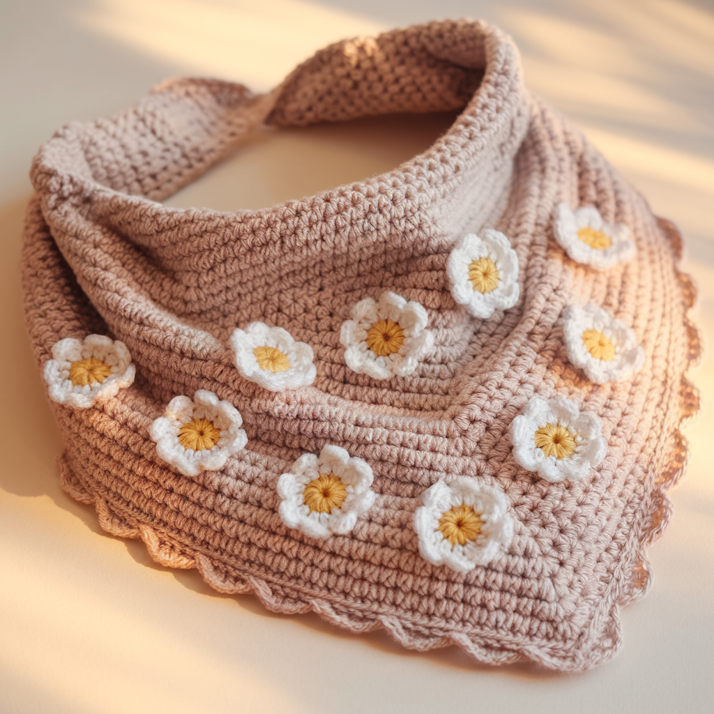 A triangular bandana with an all-over field worked in simple stitches (HDC/DC) and decorated with applied or embroidered little daisy motifs — “oopsy daisies” in scattered placement for a playful boho effect.