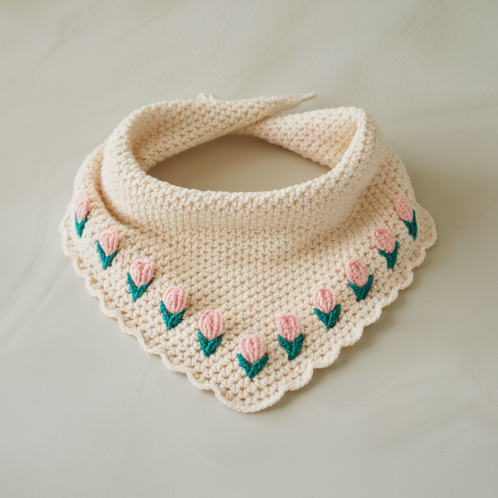 A triangular bandana with a repeating tulip motif worked as small appliqués or mosaic inserts along the bottom edge — floral and boho.