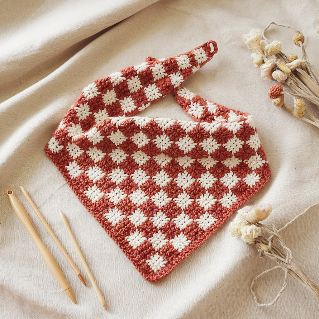 A crochet bandana is one of the quickest, most satisfying accessories to make — it’s small, uses little yarn, and instantly adds a handcrafted, boho edge to any outfit. Bandanas can be worn as neck scarves, hair wraps, bag accents, or face-framing headpieces. In this post you’ll find six full bandana patterns that span from graphic checkers to lacy granny-squares and floral motifs. Each pattern includes: materials, suggested yarn & hook, gauge notes, a step-by-step pattern written in US terms, clear measurements and how to alter size, finishing/assembly, styling ideas, and variations.