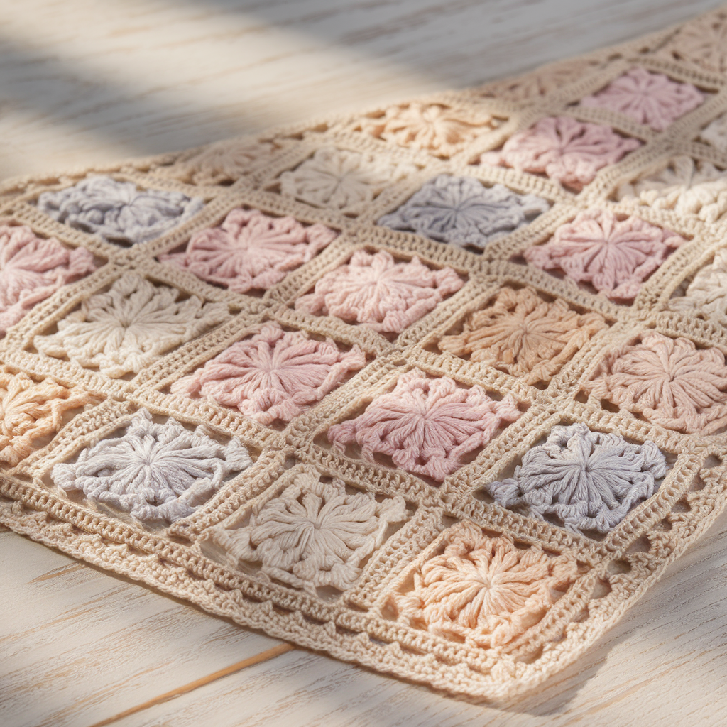 - Round 2: Into each corner-ch-2 space work (3 DC, CH 2, 3 DC); between corners work CH 1 or 3 DC cluster depending on desired openness. Continue rounds until square measures about 20–22 in across (for triangle fold).