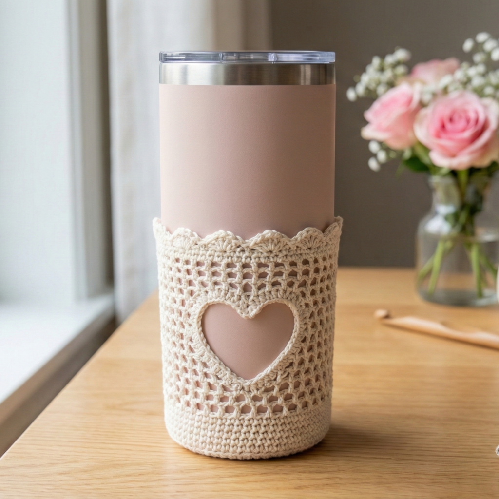 A romantic, airy cozy featuring little heart cutouts in a lace field—lovely for Valentine’s gifts and pretty packaging.