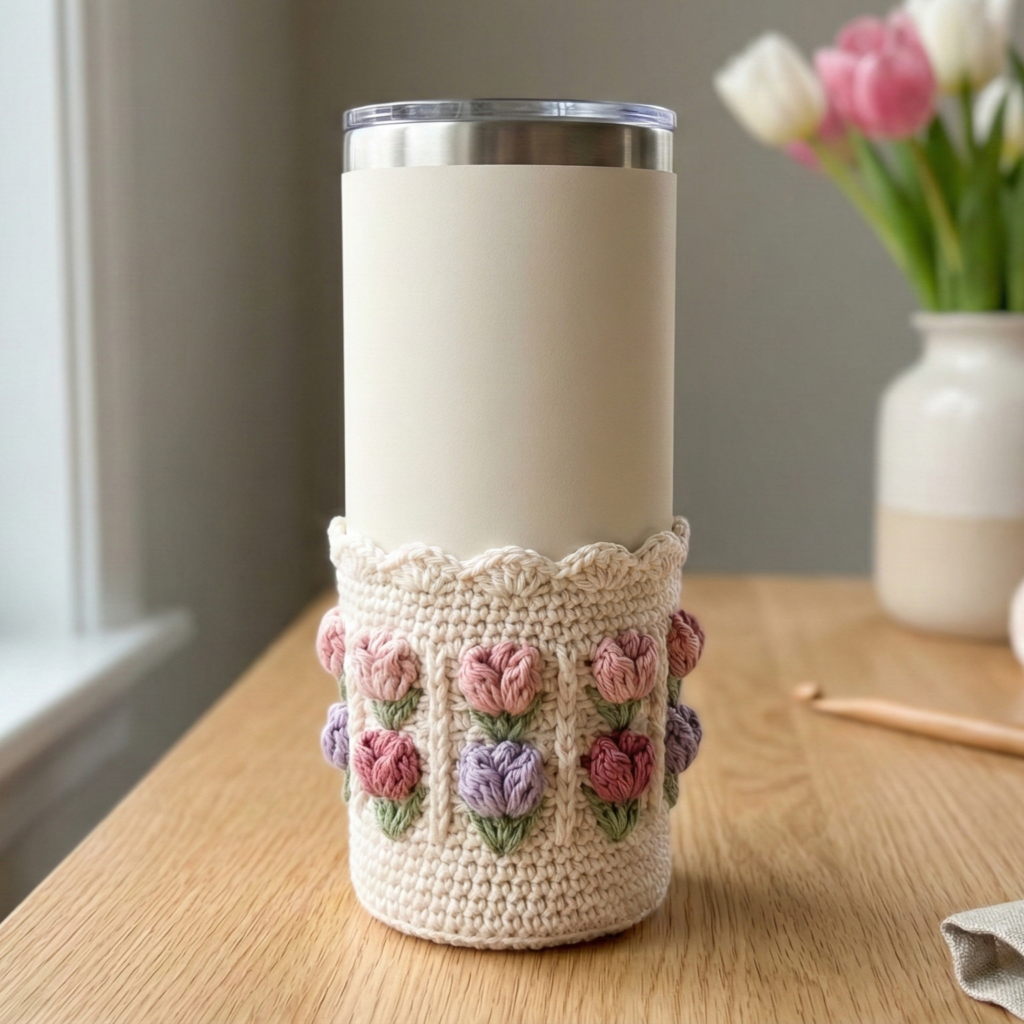 - Swatch the tulip repeat: make one vertical repeat about 1″ wide by 1.5–2″ tall so you know how many repeats fit around your bottle. Suppose one repeat = 1 in and bottle circumference = 9 in → need 9 repeats (stitches adjusted to pattern repeat).