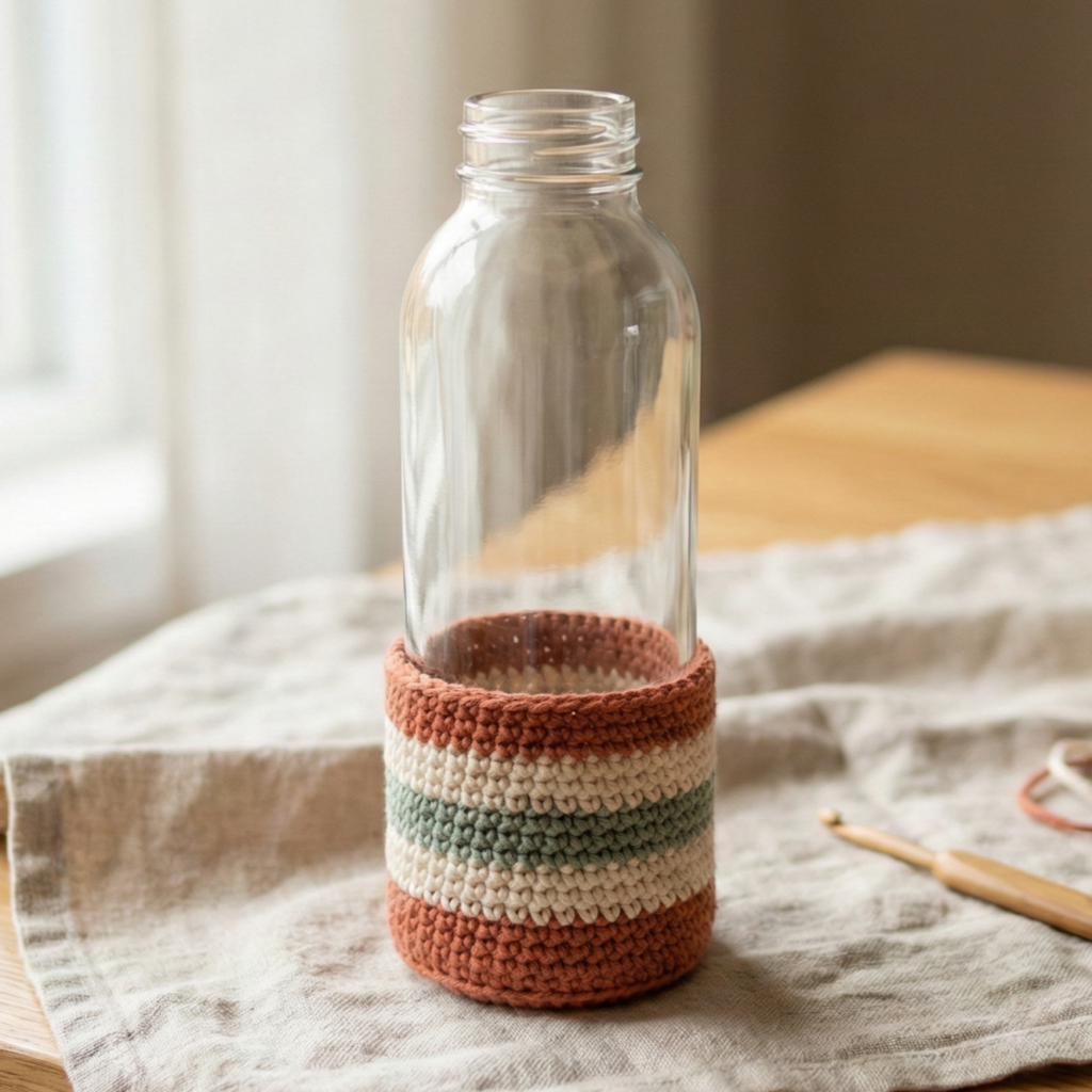 - Flat panel & seam: crochet a rectangle and sew seam to wrap bottle — fast and easy for color-work or stripes.