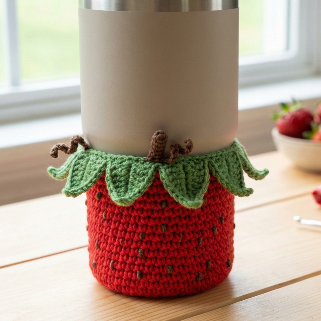 3. Leaf ring: ch 30 (or circumference of top, whichever fits), join; Round 1: sc in each ch to form a strip. Round 2 (leaf round): ch6, sl st in next st around to create loops, then work shell petals into each ch6 — (sc, hdc, 3 dc, hdc, sc). This makes leafy points that will look like strawberry leaves. Slip-stitch leaf ring onto top edge, or make a small removable cap that tucks over the rim and fastens with a tiny button/loop.