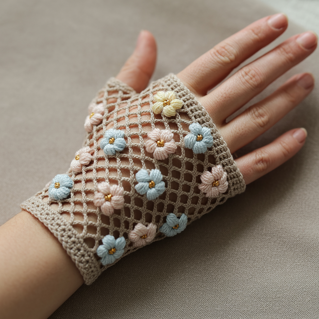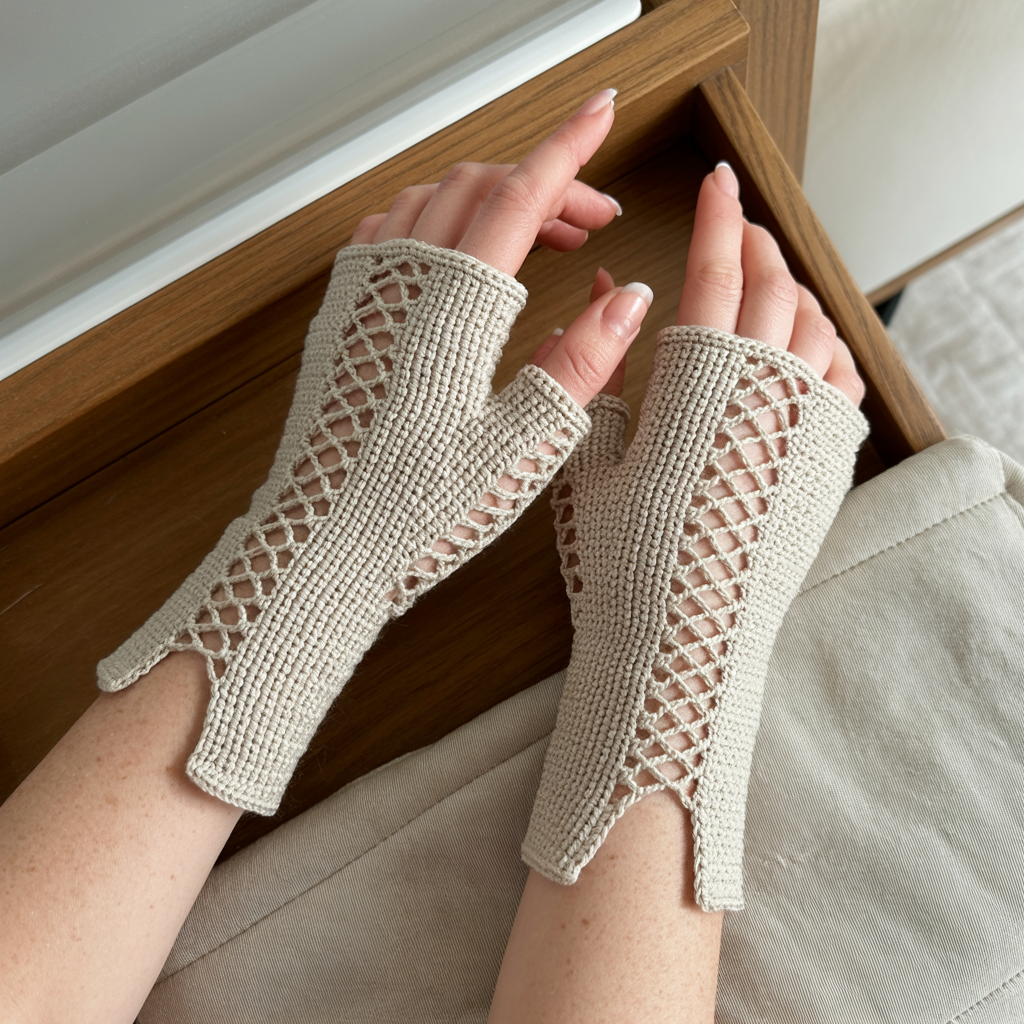 - Try on as you go. Especially when you plan the thumb opening — adjust chain count so thumb fits comfortably and palm coverage hits the base of fingers.