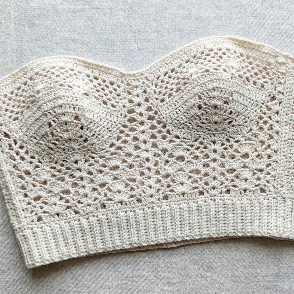 - Add underbust ribbing as in Pattern 1: firm hdc rounds in BLO. Insert elastic into a casing if you prefer a cinched underbust.