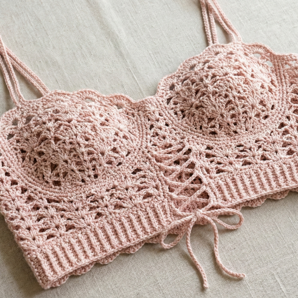 - Crochet lace panel flat: chain 62 (60 stitches + edge). Work lace pattern rows (example: diamond eyelets + small shells) until reaching desired length from neckline to underbust. Add shaping at bust with small increases along sides or short rows over cup area.