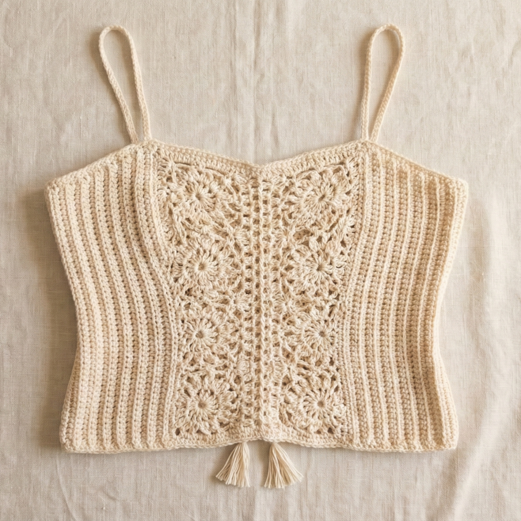 Crochet corset tops can take many forms — from ethereal lace to structured paneling — and each of the six patterns above offers a different way to explore shaping, textures, and finishing techniques. Key practical reminders: