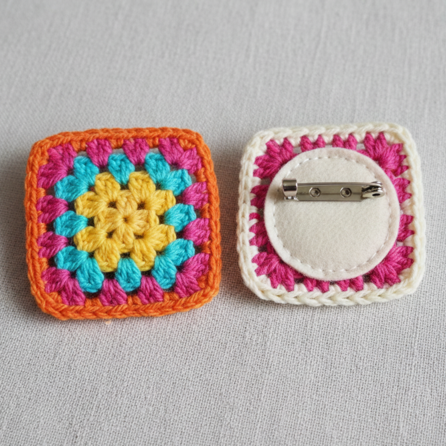 - Add a tidy single-crochet or sc border if desired. Press lightly to square. Attach to felt backing and sew on the pin.