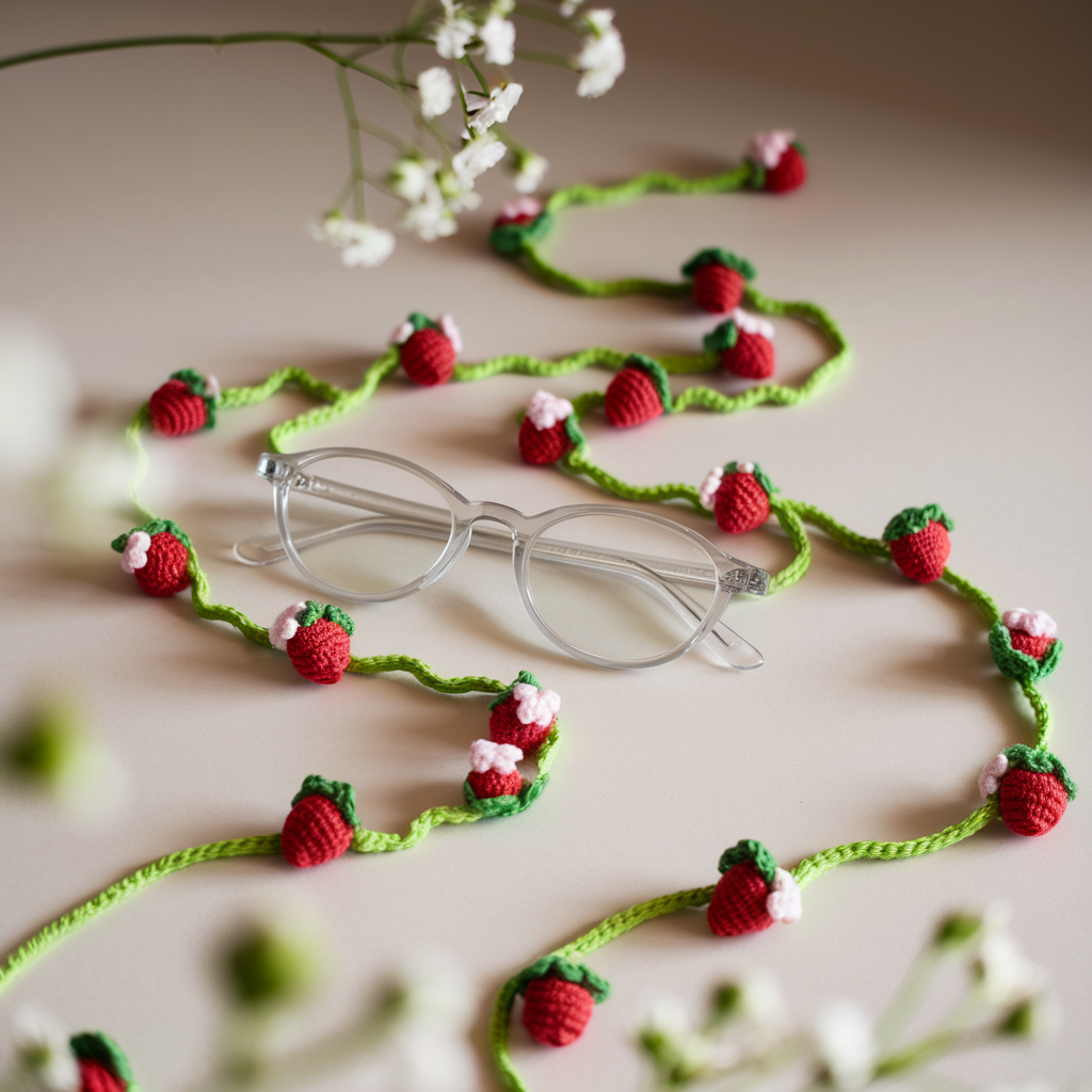 This adorable strawberry-themed glasses chain adds a playful but sweet look to your daily outfits. The motifs are small, lightweight, and evenly spaced along a thin crocheted cord. Natural reds, soft greens, and creamy off-whites create a warm, organic palette rather than a bright artificial one.