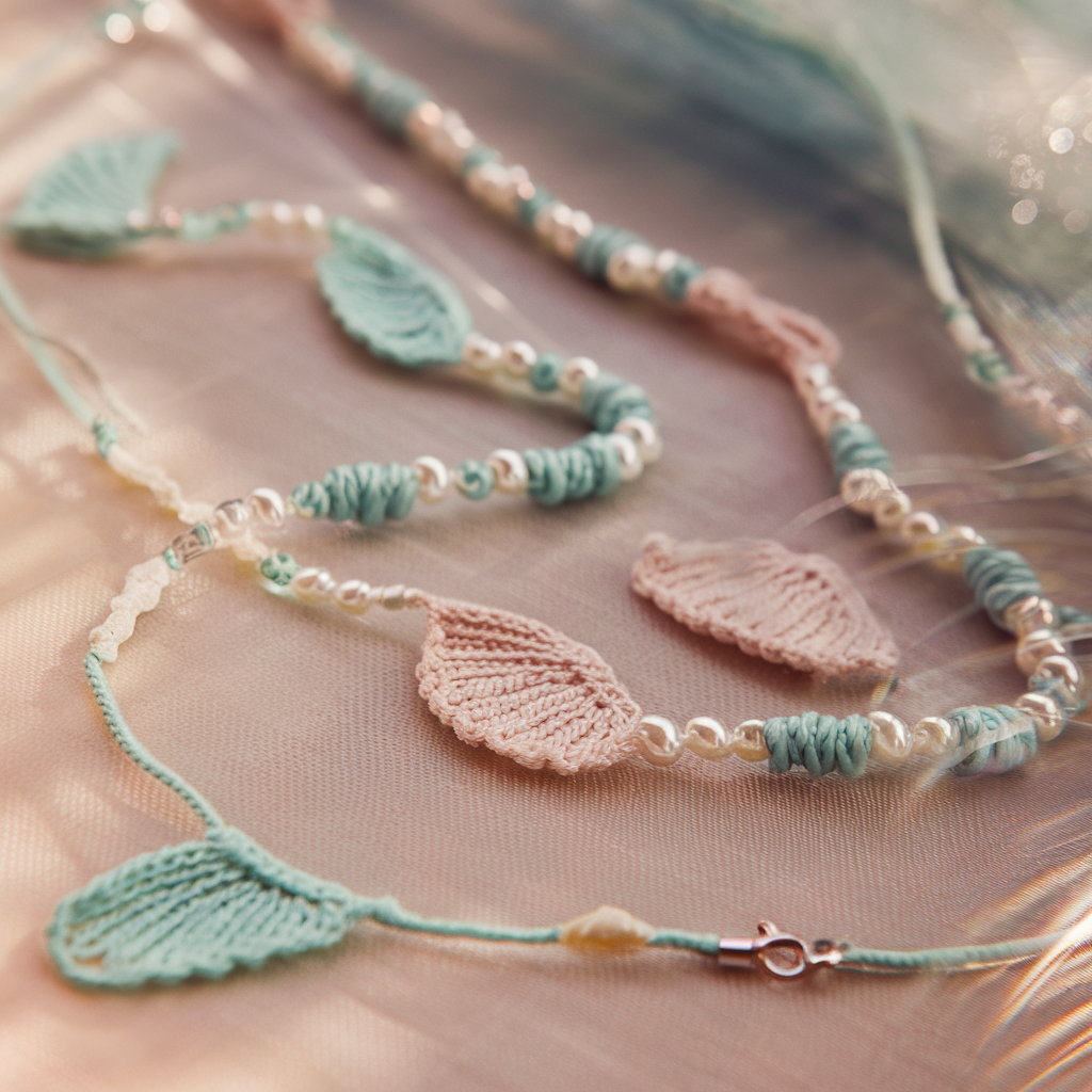 A romantic, blooming “trail” of flowers and leaves running along a soft crochet cord. This one feels whimsical and organic — like a tiny garland draped across your shoulders.