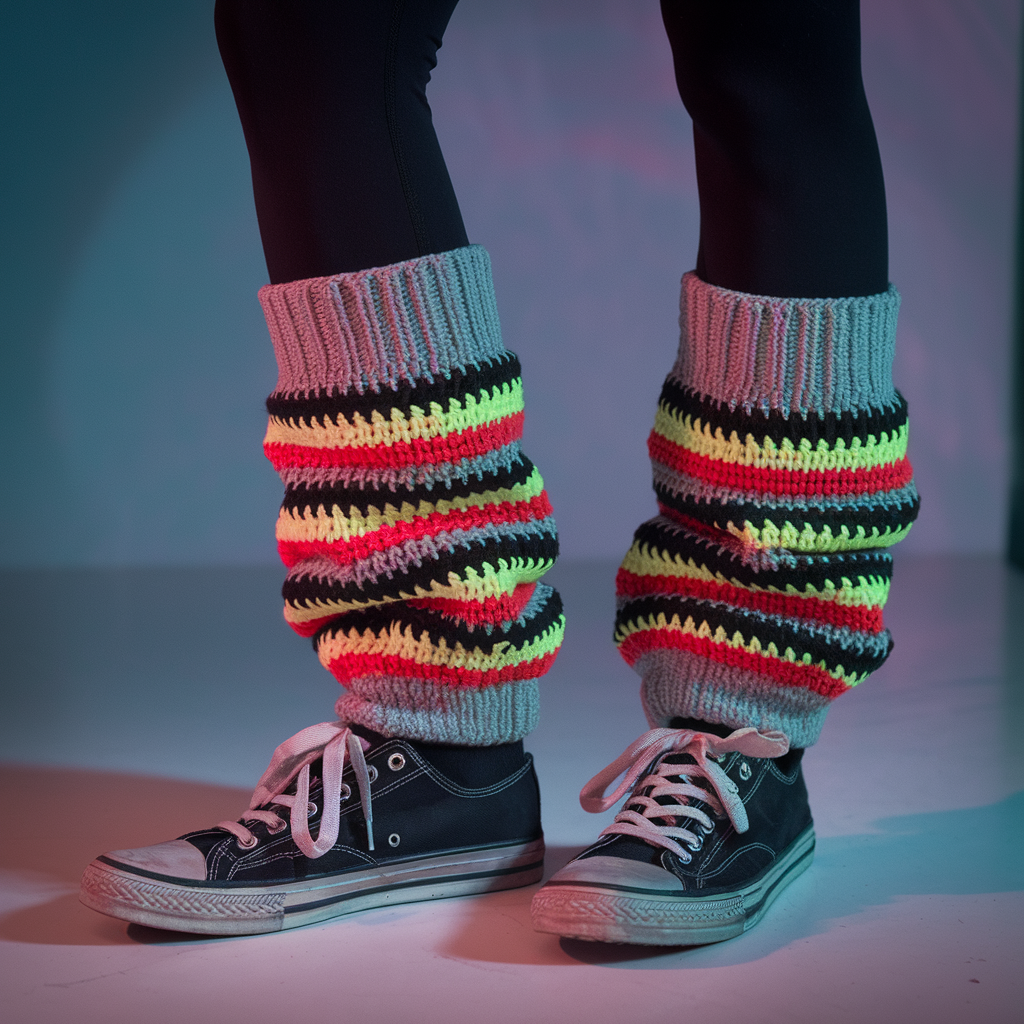 - Go loud: neon paired with black leggings is the practical 80s look. Use variegated yarn for a quick gradient without changing skeins.
