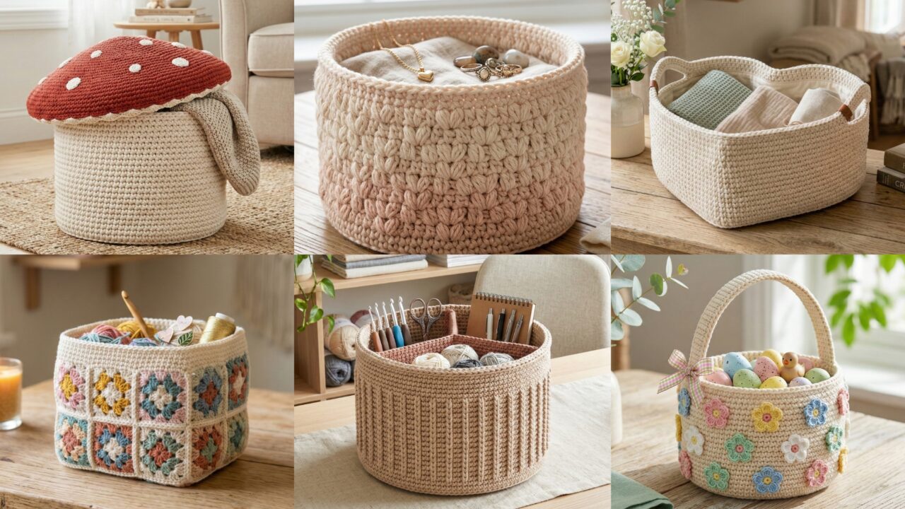 Baskets are the unsung heroes of home organization — practical, pretty, and instantly personal when made by hand. Whether you need a whimsical toadstool basket for a kid’s room, a sturdy spike-stitch basket with removable dividers for craft supplies, or a romantic puffy-heart basket for the entryway, these six patterns give you variety in shape, texture and function.