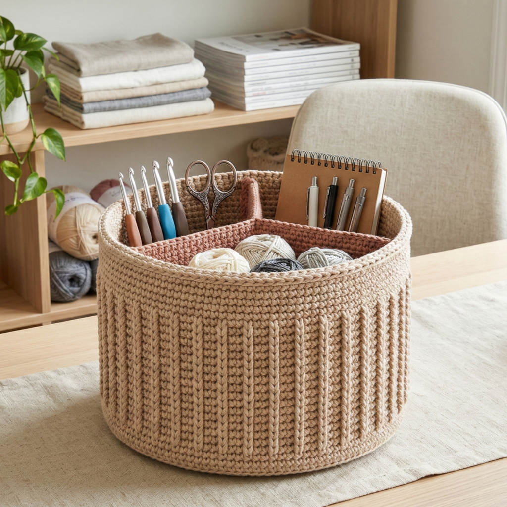 A practical, sculpted basket using spike (long) stitches for a firm ribbed texture and a removable divided insert for organizing craft tools, cosmetics, or office supplies.
