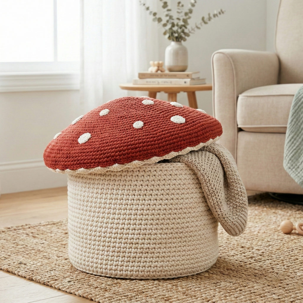 A whimsical mushroom-shaped basket — great for toys, small blankets, or seasonal decor.