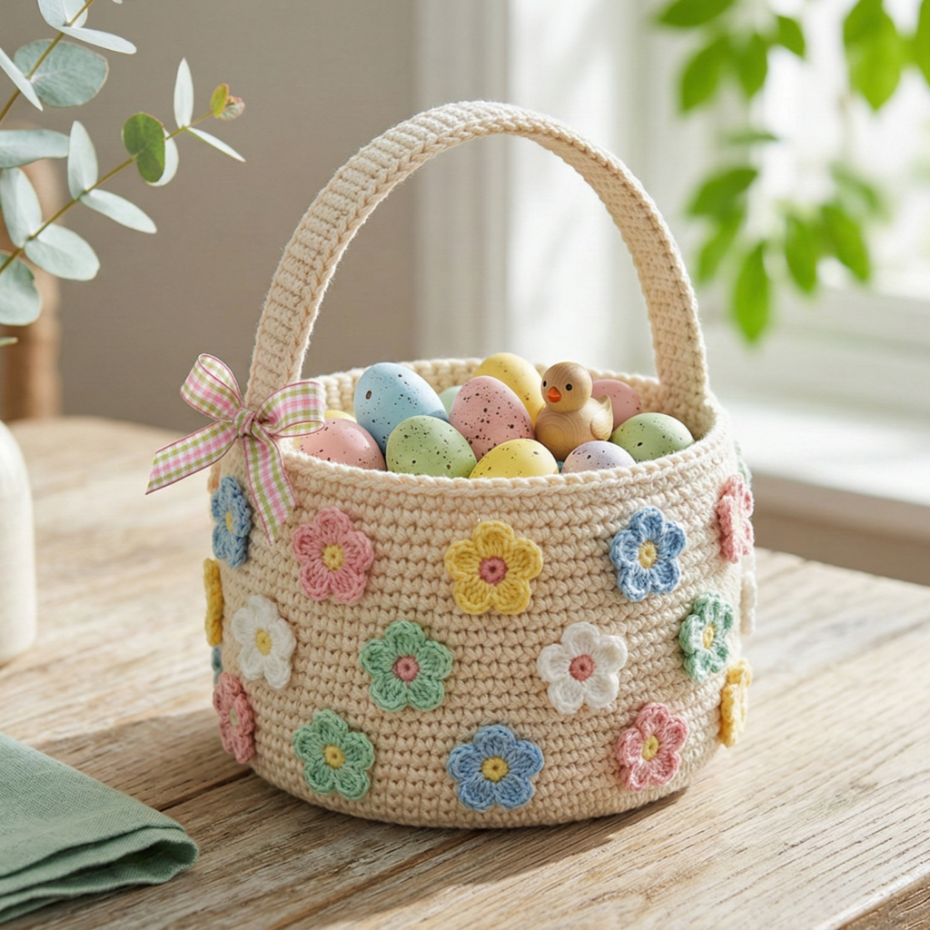Make a sturdy base circle, build walls of sc, and decorate exterior by sewing small 5-petal flower appliqués in rows. Add a simple crocheted handle or a ribbon-wrapped handle for a classic Easter look.