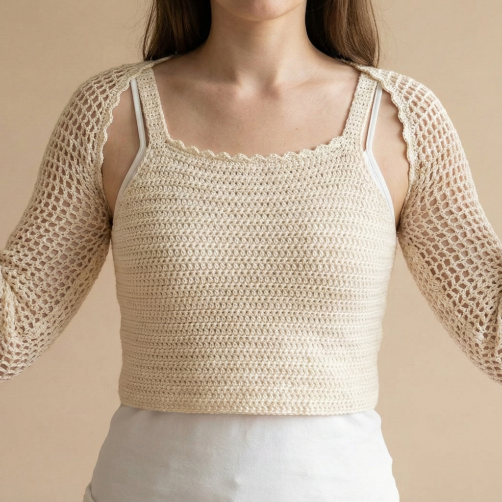 - Construct a fitted body panel in plain hdc or sc (for structure) and add airy mesh sleeves worked in V-stitch or chain ladder mesh. Work sleeves in the round for a seamless finish.